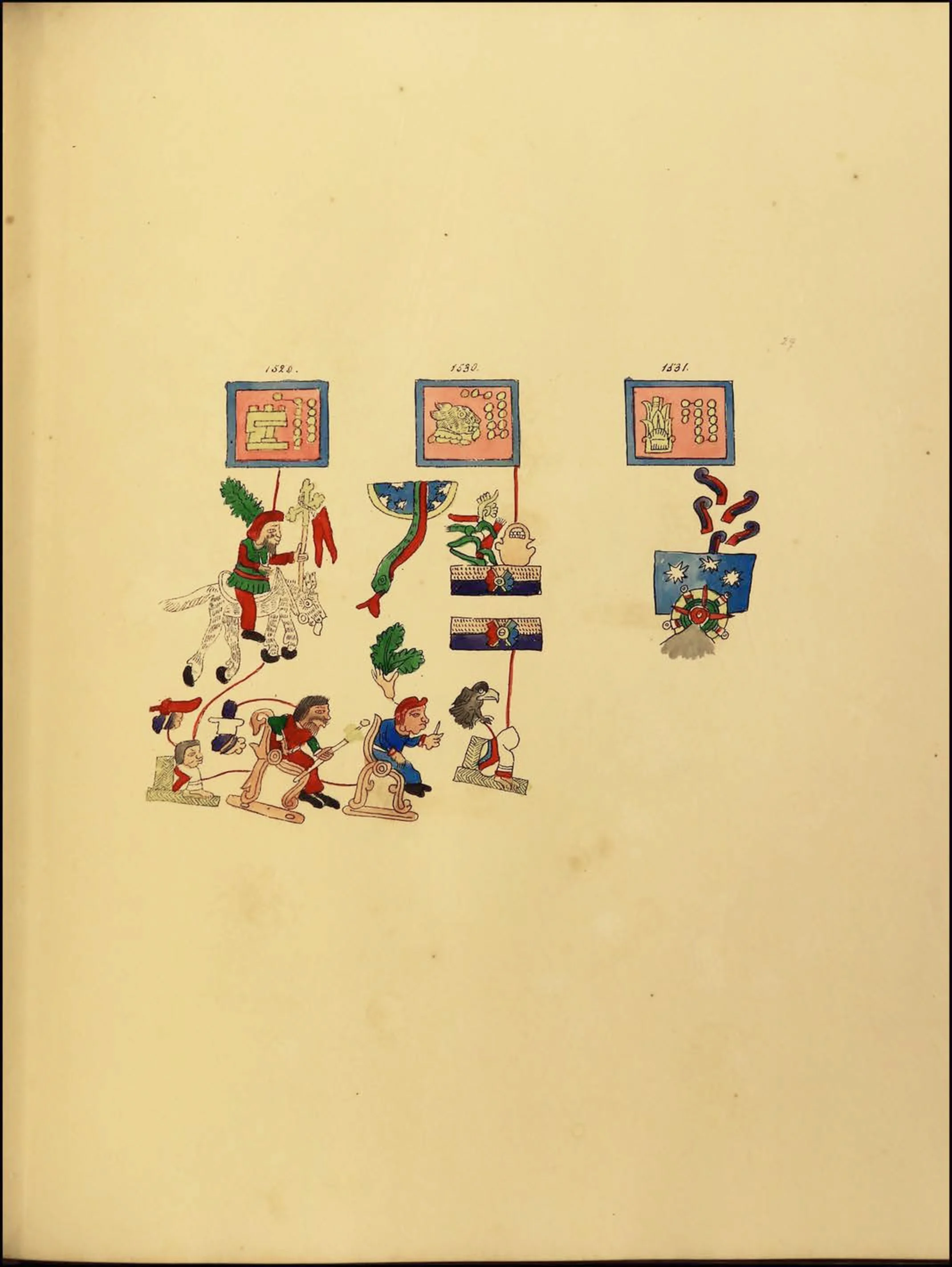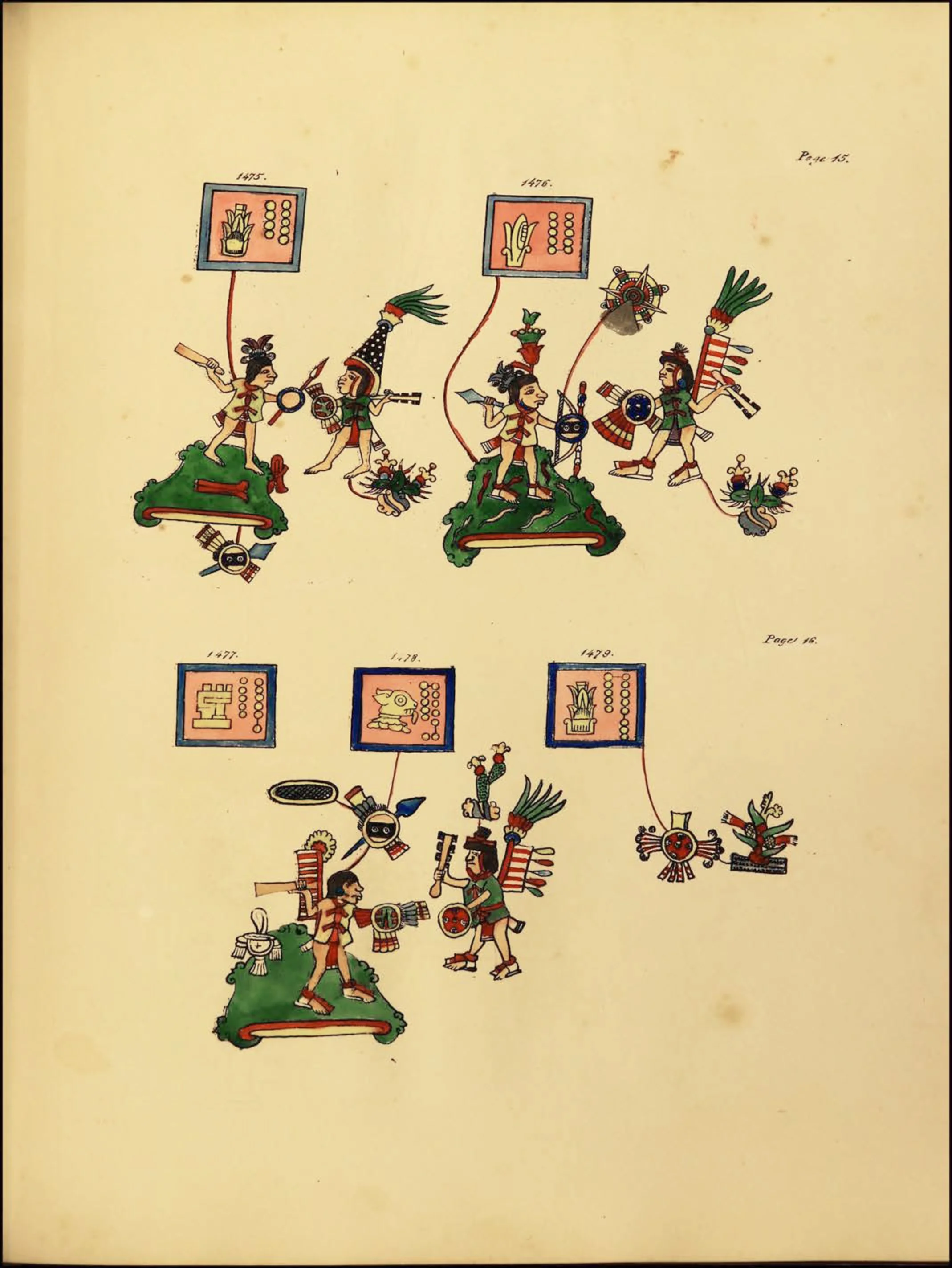 The third section is a history, itself divided into two sections which differ stylistically, an account of migrations during the 12th and 13th centuries, while the remaining pages of the codex record historical events, such as the ascensions and deaths of rulers, battles, earthquakes, and eclipses, from the 14th century to the 16th century.
